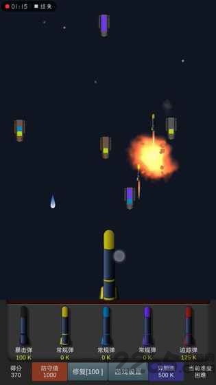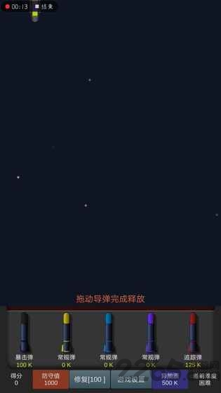 它是充满挑战的休闲类游戏!在公元2028年,异星文明为了抢夺生存环境对地球发起了进攻,人类建造了地球防御系统,一场激烈的战斗由此展开。拖动导弹到发射台上即可完成释放,每种导弹只能攻击对应颜色(或符号)的敌人,释放导弹需要消耗相应的异能源。