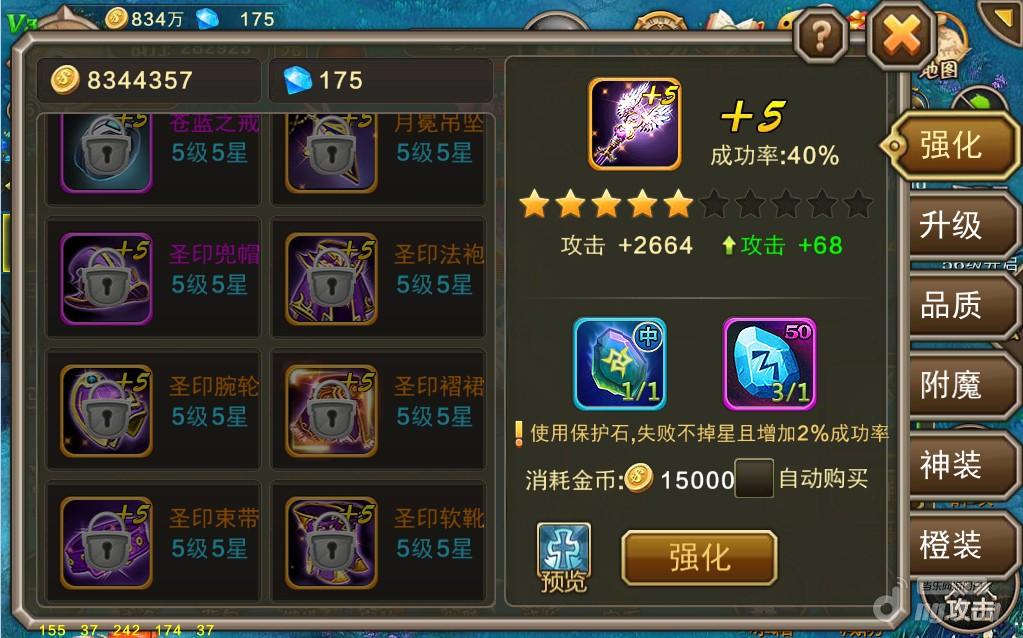 40级后,将会开启三种玩法,分别是异域历险,狩魔之战和精英BOSS,这三种玩法都会产出大量的装备材料。其中强化石用于装备强化,强化+1到+3使用初级强化石,强化+4到+6使用中级强化石,强化+7到+9使用高级强化石。一般活动和副本多产出低级强化石,各位可以通过合成功能得到更高级的强化石。建议40级以后,首先努力收集强化石,让全身装备强化+4,战力自然就上去了。值得注意的是,强化+1到+3成功率较高,+3升+4的时候成功率会降低到50%,这时候使用保护石可以保证强化过程中不掉星哦!