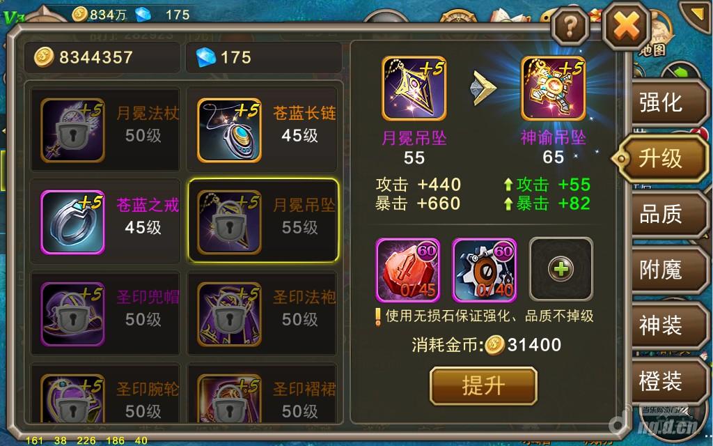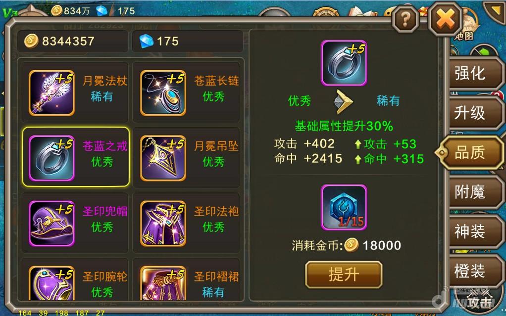 装备品质分为4个级别,分别是普通、优秀、稀有和完美,提升装备品质只需一种材料,并且100%成功,那就是品质石。别看着似乎很简单,因为品质石前期产出途径较少,概率较低,属于游戏的珍稀物品,所以算是装备里比较难提升的一个系统了。从普通升到优秀品质,每件装备需要5个品质石,全身装备优秀后会激活一个成就,建议大家有条件先把全身装备品质提高到优秀,然后再囤好品质石集中提升武器、护符、吊坠和戒指四个,提高攻击力。