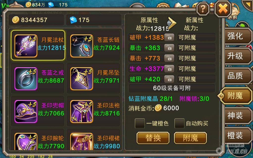装备附魔需要需要使用钻蓝附魔晶这种物品,异域历险、狩魔之战和精英BOSS等玩法互动都有产出,而且产出比较容易,是前期比较推荐去提升的一个系统。附魔的槽位是根据装备等级而开启,比如说你武器40级,就有4个附魔槽,你的衣服升级到50级就开放第5个附魔槽,最多开放6个附魔槽。只要你点击右下角的附魔按钮,就会给你洗出不同的属性,新附魔出来的属性在上方会有战力对比,只要看见战力较高的替换过去就可以了。当然如果你洗出了紫色或橙色这种万中无一的高级属性,想要锁住它不让它替换掉,在拥有附魔锁的情况下,在附魔之前点击属性右侧的锁头按钮,属性上锁后再进行附魔和替换就可以了。注意附魔锁的使用顺序不能乱哦~