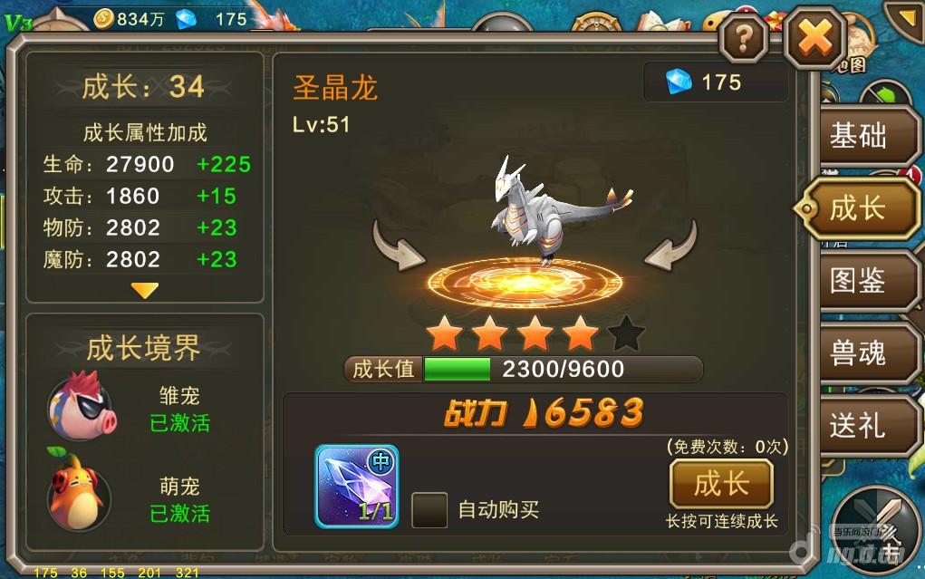 宠物前期只会开放属性、成长和图鉴三个标签,属性是查看玩家宠物信息的地方,如属性、经验和激活的技能等;成长标签内可以使用成长水晶提升宠物的成长等级,激活成长境界从而获得属性加成;图鉴标签内玩家可以通过搜集到的宠物魂片激活新的宠物形象或者对旧的宠物进行升阶,提高宠物的战斗力并且激活宠物技能。成长水晶可以通过商场购买,所以有条件的玩家能一口气把宠物成长培养到很高的等级,而宠物图鉴除了圣晶龙只能通过淘宝获得,白、绿、蓝三种品质的宠物魂片可以通过宠物副本获得,紫色的宠物魂片可以通过幻兽群岛玩法获得。后续还会开放兽魂和宠物送礼系统,因为开放等级较后,作为新手攻略这里就暂不介绍了。