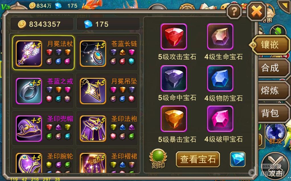 39级左右会开放宝石跟夺宝两个系统,前者在装备上镶嵌宝石从而获得大量战力,后者通过夺取别人的宝石碎片合成宝石,是宝石的主要产出途径。每件装备一开始都只开放三个孔镶嵌宝石,前期只要拿到宝石什么都不用管全镶嵌在宝石孔里,那么战力一下子会提高很多。等开放的宝石孔全满了,有条件的玩家可以去开孔,每件装备最多有6个宝石孔。而暂时不想开孔的玩家,可以通过合成、熔炼这两种途径获得更高级的宝石,替换原本镶嵌在装备上的宝石,越高级的宝石战力加得越多,所以你懂得!另外悄悄告诉你一个秘密,每件装备镶嵌3块5级宝石有惊喜哦!
