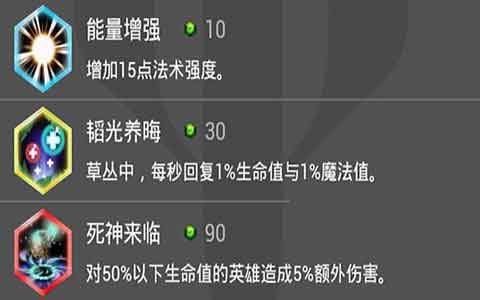 其次我们选择的是韬光养晦,增加的回复能力可以有效提高续航能力,解决魅缺蓝的问题,让魅更好的消耗对手和占线发育,虽然提高移动速度的天赋非常诱人,但是魅拥有三段位移,所以那3秒的移动速度显得不那么重要了。死神来临是我们必不可少的天赋之一,也是我们的主要的辅助天赋,对50%以下生命值的英雄造成5%额外伤害,增加伤害在斩杀英雄时十分好好用,看到血少的上去就一套带走!是不是很厉害呢。