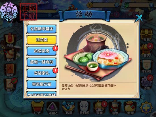 2、每日12:00——14:00和18:00——20:00在这两个时间段内可以通过桃花羹活动领取体力值,体力是增长人物角色经验的要素,有了更多的体力值就可以进行更多次数的历练副本扫荡,获得更多的角色经验。
