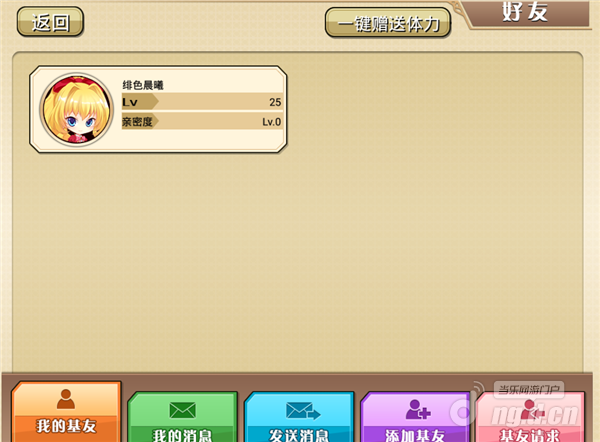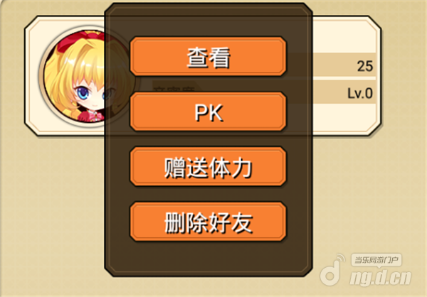 我的基友:好友列表显示,并可以选择好友进行“查看”、“PK”、“赠送体力”、“删除好友”操作。