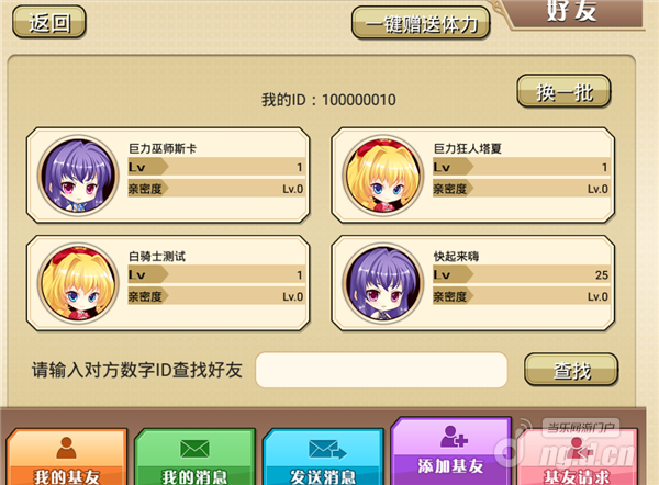 添加基友:搜索查找好友,并进行添加,也可查看到自己的角色ID。