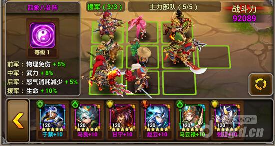 推荐理由:主T加援军T,双奶2保1,DPS关羽周瑜。关羽的单体输出和群体输出伤害可观,周瑜大招伤害可观,离间技能扰乱敌方战斗节奏。阵法前军增加物免,中军武力加成,后军减怒气消耗更快释放出大招。