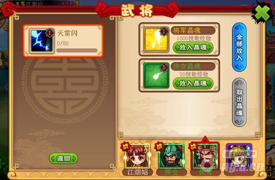 技能等级的高低会影响战斗胜利的走向,提高技能等级可以在战场中立于不败之地。升级技能需要用到晶魂,在副本、古墓探索、百人斩中都有掉落。武将培养