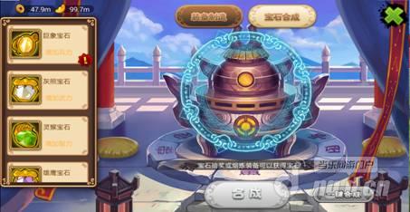 宝石分为6种,合成它们分别可以增加武力,兵力,智力等等。每种宝石有1-5星,每个星级的宝石数量达到要求就可以进行合成,当有多个宝石可以合成时,可以使用一键合成按钮。