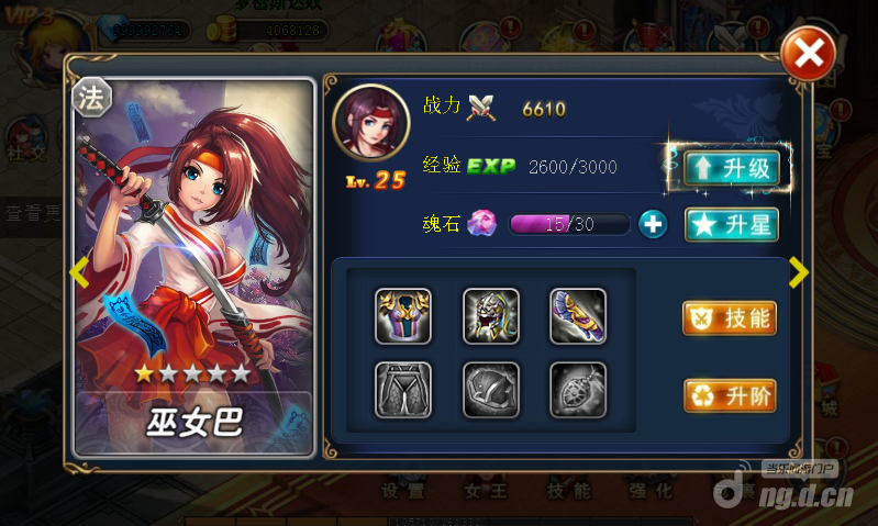 3、可以消耗对应女王的灵魂石升星,星级的不同,女王的属性也会不同。女王的灵魂石主要通过女王副本和寻宝的黄金宝箱获得。