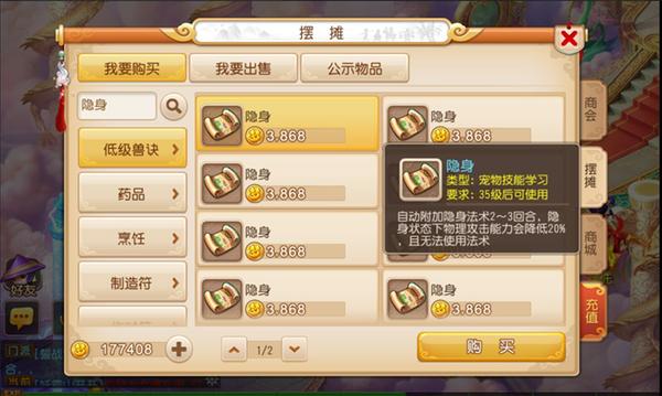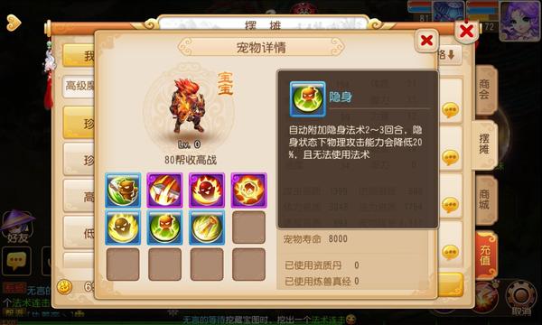 高级隐身:自动附加隐身法术3~5回合,隐身状态下物理攻击能力会降低15%,且无法使用法术,市场价大约在13万金左右。