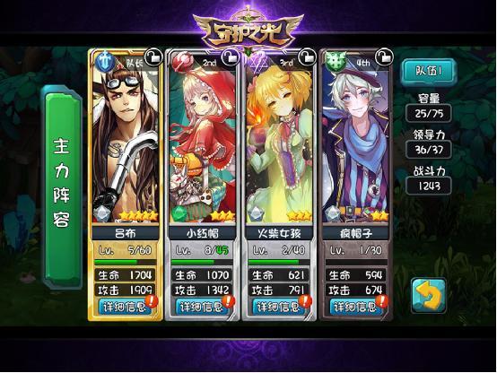 主要角色:小红帽(战士)、疯帽子(治疗)、火柴女孩(法师)、吕布(骑士)