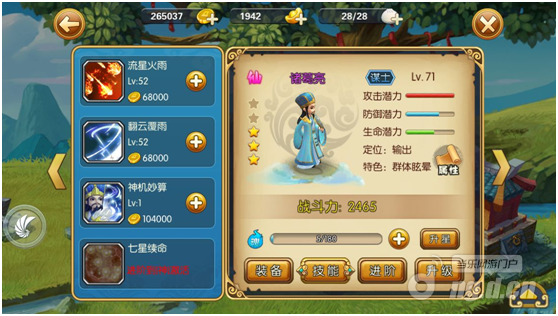 诸葛的技能都是范围技能,技能1全体伤害和眩晕,在保证输出的情况下,给敌人造成眩晕也是诸葛的得意技,在前期先手给敌人痛击,如果造成眩晕敌方玩家可能连出手的机会有木有,技能2虽然没有带眩晕但是伤害是非常的痛,敌方残血基本中了此招就会去西天取经了,技能3因为输出的英雄都是很脆弱,血不厚扛不起高伤害,所以弥补了自己的短处,当然这个技能升级也是相当的消耗资源,所以诸葛一般小编会排在队伍第三个出手的位置,前面有肉盾,后面也有肉盾只为保证诸葛的输出,再此小编还是要说那句话的诸葛者便得天下。刷副本,幻境和比武都离不开他哦~