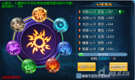 2、每种七曜需消耗对应的碎片才能提升等级,混沌碎片可以替代任意一种碎片。3、碎片可通过在线活动、副本以及商城购买获得。