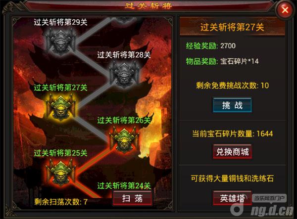过关斩将一共有50关,每天可以免费挑战10次,每次完成的时候获得一定数量的宝石碎片。而如果消耗元宝使用扫荡功能的话,就会直接从第1关开始,一直到你已经成功挑战过的关卡全部都扫荡一遍!也就是说如果你已经打通全部50关的话,就会从1到50关所有的奖励都再拿一遍咯!不过由于这样的奖励实在太过于丰富,所以扫荡每天的次数是有限的。