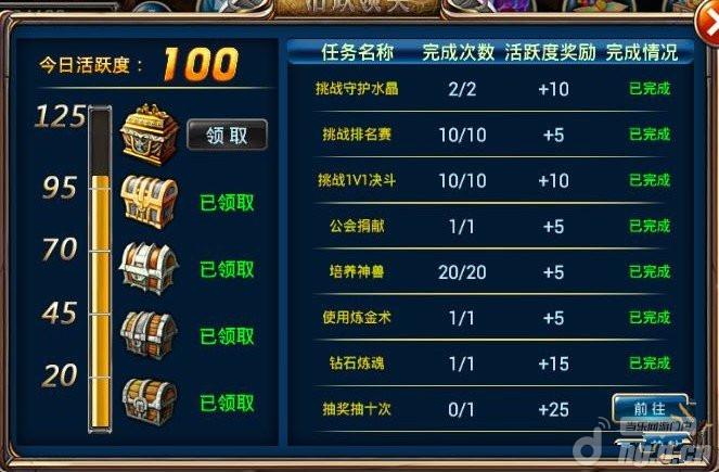 首先每日活跃度为125点,其中需要钻石完成的有:钻石炼魂(50钻),使用炼金术(2钻),抽奖抽十次(358)。而这三样合计活跃度是45点,如果都选择不做的话,那么就只能领到前面3个箱子。