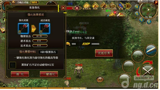 只能通过黑铁石强化武器,每次强化不消耗金币但需要消耗三颗相应等级的黑铁石,该强化效果只产生于所强化武器上,武器最大可强化到12级,黑铁石不足时可以直接消耗元宝购买强化等级