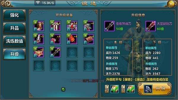点击【锻造】—【升级】,进入到装备升级界面,选择需要进行升级的装备,消耗对应的升级材料以及银子就可以对该装备进行升级。
