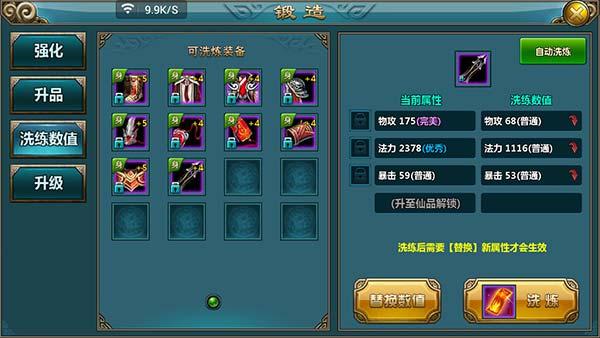 点击【锻造】—【洗练】,进入到装备洗练界面,选择需要进行洗练的装备,消耗对应的洗练材料以及银子就可以对该装备进行洗练。