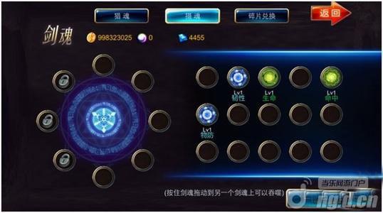 猎魂:就是点击右边蓝色方框,可以花费金币进行猎魂,可以随机爆出不同颜色的“剑魂“,(也有可能是炉渣,点击一下就可以换钱)