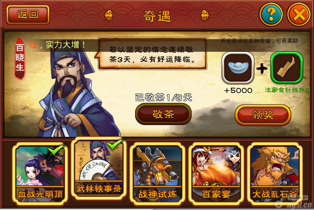 8、连续拜谢前辈,完成3~5天的拜谢任务可获得额外奖励哦(各种品级的武功/装备);