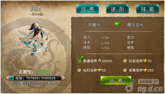 仙子给角色提供大量属性,玩家通过培养增加仙子的三围属性,通过进阶改变仙子造型和培养上限。