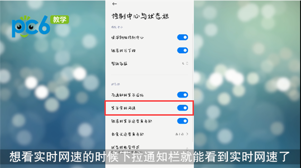 步骤三:就能看到【显示实时网速】功能了,步骤四:将其打开,想看实时网速的时候下拉通知栏就能看到实时网速了。