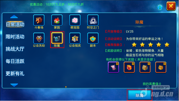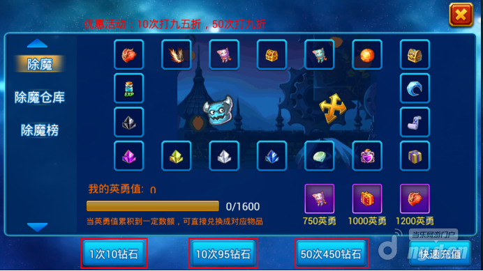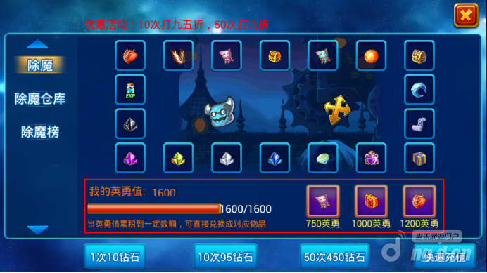 每次除魔玩家均可累积一定的英勇值,在英勇值达到指定量后,玩家可以兑换限定的珍惜道具。点击想要的物品可直接兑换。