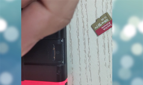 在NS主机的后方有一个和主机外壳与众不同的塑料板,掰开塑料板便可看见储存卡插槽,将SD卡从插槽中推入便可插入SD卡。NS主机中的内存容量并不高,而且这些内存容量还会被存档、和截图占据,卡带中的游戏数据并不会存储在游戏卡带之中,也需要下载到主机内存再开始游玩。所以NS在正常使用时是需要一个SD卡的,而且SD卡也可以将数据文件转移到电脑之中,更方便玩家们分享拍摄的游戏截图。