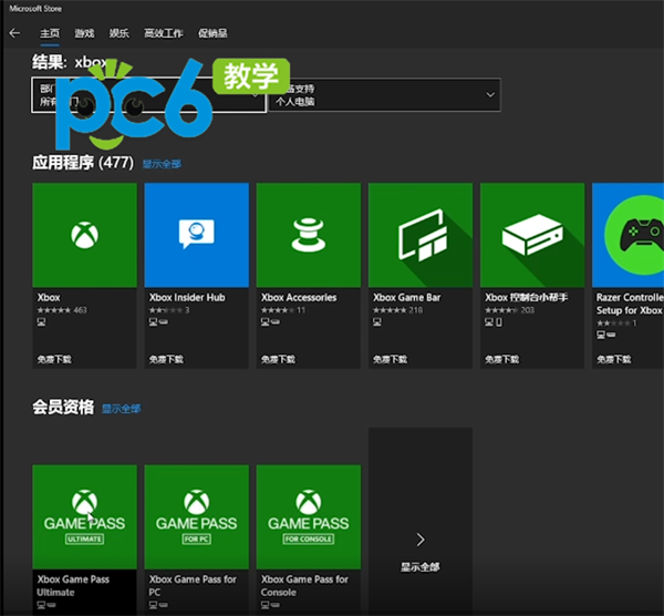 3.点击进入windows10系统的应用商店页面,在商店页面中选择右上角搜索栏,在搜索栏中搜索xbox,在下方的服务中就可以查看微软所能提供的xbox game pass服务,点击进入后登录便可立刻购买xgp服务。