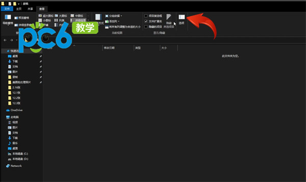 1.本教程以windows10系统为例展示如何设置文件夹的隐藏状态,windows11系统的修改方法和windows10一致。在电脑中任意点击进入一个文件夹,在文件夹上方可以查看文件夹的各种设置项,点击文件夹窗口最上方的查看选项,随后点击【选项】设置图标便可进入文件夹设置窗口。