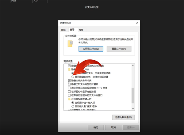 2.选择设置窗口上方的查看栏,再下拉找到【显示隐藏的文件、文件夹和驱动】,勾选设置项后点击确定即可保存文件夹设置。
