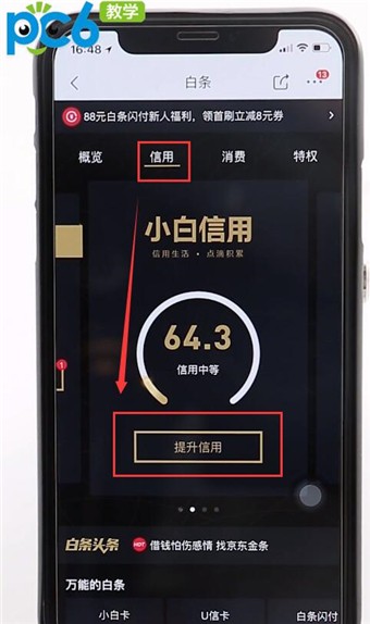 这时在小白条信用界面选择【信用】,且点击【提升信用】