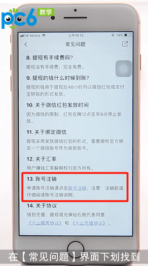 在【常见问题】界面下划找到【13.账号注销】,点击【账号注销】;