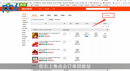 步骤三:点击“已买到的宝贝”在右上角点击“订单回收站”,