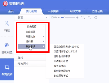 这里可以选择“自由剪裁”、“常用比例”、“证件照”等各类考试证件的图片比例;