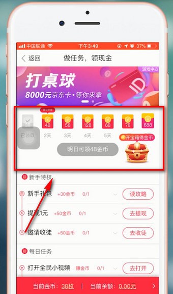 2.进入就能看到签到领金币的页面了,每天都能签到领取金币,签到7天更有大奖领取。