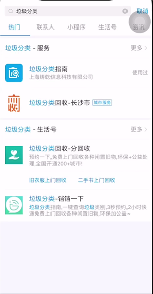 打开支付宝app,在首页顶端的搜索栏输入垃圾分类,点击小程序,