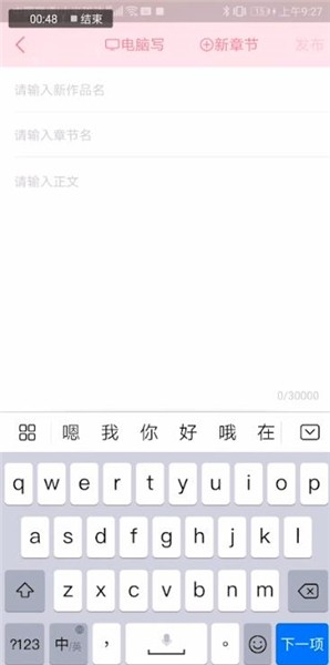 然后输入作品名章节名就可以开始写书了。