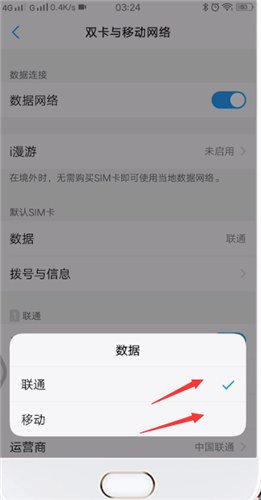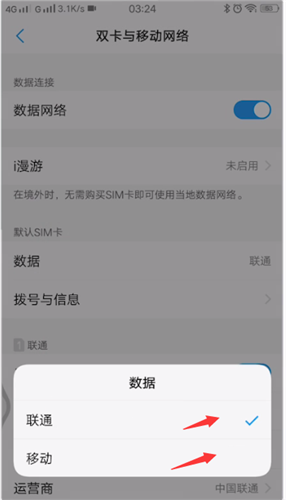 即可进入双卡与移动网络页面,点击数据,即可自由切换数据网络。