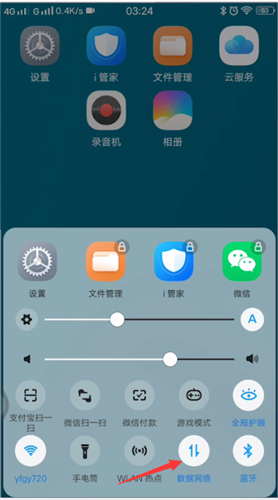 你也可以用手指从屏幕下方调出菜单栏,长按数据网络,