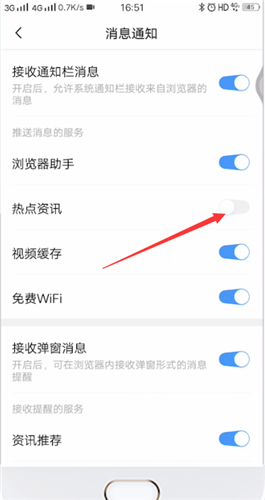 向左滑动滑块关闭热点资讯即可设置浏览器不自动推送热点资讯信息。