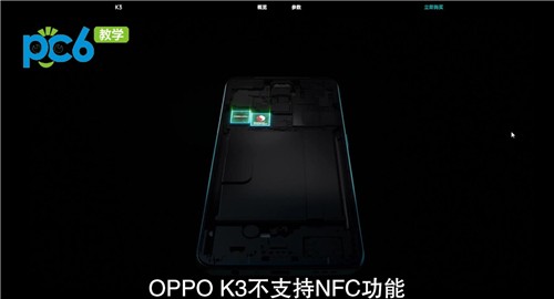 OPPO K3不支持NFC功能。在配置方面,OPPO K3搭载了高通骁龙710移动平台,最高可选8+256GB存储组合,内置3765mAh的电池,支持VOOC闪充3.0。