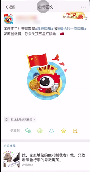 只要带话题词#我要国旗#或者#请给我一面国旗#发布原创微博,头像即可头顶五星红旗。