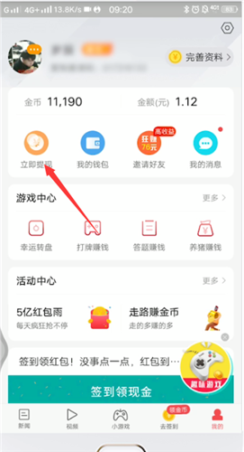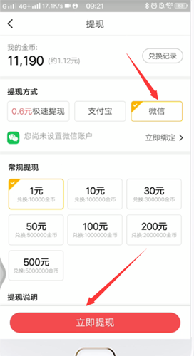 用金币来折现成现金提现,提现也很方便,点击金额,点击立即提现,
