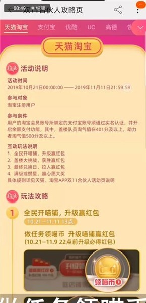 做任务领喵币,10月21日―11月9日22点前升级喵铺必得红包。
