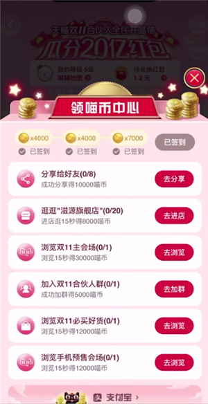 点击领喵币之后完全系统派发的任务就可以领取更多喵币,每天坚持签到也可以领取。