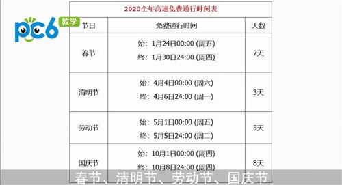 2020年春节放假时间为1月24日(除夕)—1月30日,2020年春节期间高速公路免费时间为1月24日0:00时至1月30日24:00时,共计7天春节免费高速通行时间。