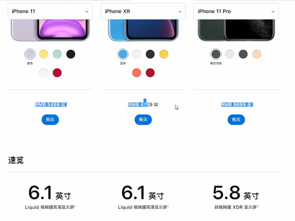 价格方面:iPhone 11价格5499起,iPhone XR价格4799起。