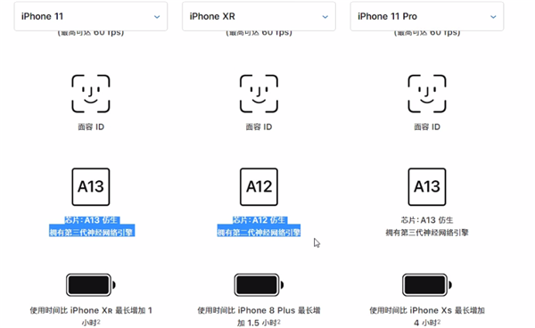 配置方面:处理器从A12升级到A13,整体性能大约有20%提升电池续航:电池容量由2960mAh提高到了3110mAh,按照苹果的说法,续航提升一小时。